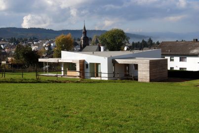 Das Gebäude liegt in Ortsrandlage und grenzt an ein Naturschutzgebiet. Die Vorfahrt ist als überdachter Eingangsbereich in Lärchenholz ausgeführt. Eine teilweise überdachte Terrasse erweitert den Wohnraum und verbindet ihn mit der Natur. Große Glasflächen lassen Sichtbezüge zum Garten und zur freien Landschaft entstehen.