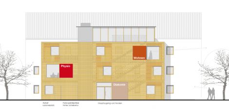 Das Haus empfängt als erstes Gebäude die Bewohner der geplanten Wohnanlage. Der Eingangsbaukörper mit Holzver-schalung signalisiert mit farblichen Akzenten die Wohn- und Sonder-nutzungen. Der kompakte Massivbau erfüllt den KFW 55-Standard. Insgesamt neun Einheiten können flexibel an unterschiedliche Nutzungen angepasst werden.