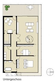 Der Entwurf wurde für ein Grundstück mit starker Hanglage in Strinz-Margarethä entwickelt. Der Garten befindet sich auf dem Dach, da er auf dem steilen Grundstück als Ebene Fläche nicht möglich ist. Das Erdgeschoss besteht aus einem Pavillon, wo sich Eingangs-, Koch- und Essbereich befinden. Durch seine Anordnung wird die Gartenfläche nicht unnötig verschattet! Die an diesem Nordhang üblichen Souterraingeschosse -kostenintensiv und in unattraktiver Lage- werden vermieden. Lediglich die privaten Wohnräume sind in einem in einem Geschoss am Hang untergebracht. Es wird zusätzlich über das Dach belichtet und bietet einen herrlichen Ausblick auf das Dorf und den Taunus.
