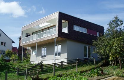 Auf einem relativ kleinem Grundstück mit Südhanglage sollte ein EFH zunächst am Fußpunkt des Hanges errichtet werden. Gleichzeitig stand eine Puddelkaut im Norden des Grundstückes zur Disposition. Unser Vorschlag stellt das Wohnhaus zusammen mit Stellplätzen auf die Kaut. So erspart sich die Bauherrschaft nicht nur den Rückbau, sondern wohnt in Ihrem Terrassenhaus in Südausrichtung mit herrlichem Blick über die Landschaft. Der Garten im Süden bleibt frei von einer Bebauung und wird mit Regenwasser aus der ehemaligen Kaut versorgt.