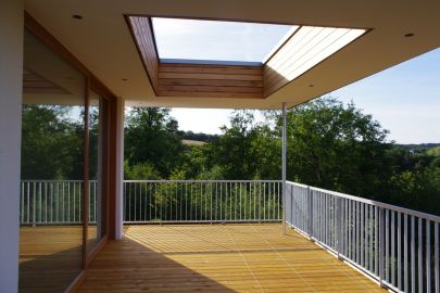 Der Entwurf reagiert auf die relativ steile Hanglage, indem das Haus auf Stützwände gestellt wird. Auf einer Länge von ca. 17m schiebt sich das Gebäude den Baumkronen entgegen und berührt dabei die Landschaft so wenig wie möglich. Der neu geschaffene Ausblick über das Tal, in die Natur und über den Ortskern machen die Lage des Eckgrundstücks einzigartig. Unter dem Gebäude entsteht ein attraktiver, überdachter Außenraum für heiße Temperaturen im Sommer.