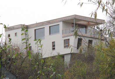 Der Entwurf reagiert auf die relativ steile Hanglage, indem das Haus auf Stützwände gestellt wird. Auf einer Länge von ca. 17m schiebt sich das Gebäude den Baumkronen entgegen und berührt dabei die Landschaft so wenig wie möglich. Der neu geschaffene Ausblick über das Tal, in die Natur und über den Ortskern machen die Lage des Eckgrundstücks einzigartig. Unter dem Gebäude entsteht ein attraktiver, überdachter Außenraum für heiße Temperaturen im Sommer.