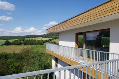 Der Entwurf reagiert auf die relativ steile Hanglage, indem das Haus auf Stützwände gestellt wird. Auf einer Länge von ca. 17m schiebt sich das Gebäude den Baumkronen entgegen und berührt dabei die Landschaft so wenig wie möglich. Der neu geschaffene Ausblick über das Tal, in die Natur und über den Ortskern machen die Lage des Eckgrundstücks einzigartig. Unter dem Gebäude entsteht ein attraktiver, überdachter Außenraum für heiße Temperaturen im Sommer.