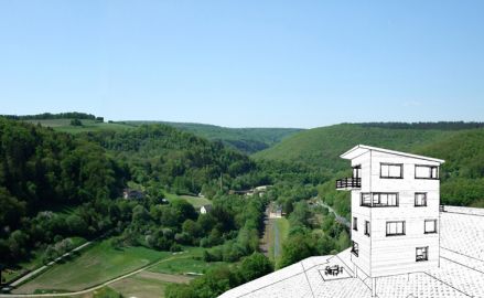 Auf dem in direkter Nachbarschaft zur Burg liegenden Hanggrundstück, entsteht ein viergeschossiger Wohnturm mit einzigartigem Weitblick über das gesamte Tal. Durch die geringe Grundfläche wird der Gründungsaufwand minimiert und die Topographie kann nahezu unangetastet bleiben. Über einen Steg neben einem Carport, oder einer Garage, erfolgt die Erschließung des Erdgeschosses. Die Wohnfläche verteilt sich auf vier Geschosse, während sich der Wohnbereich mit Balkon an höchster Stelle befindet. Unter dem Gebäude wird eine überdachte Terrasse und ein Abstellraum angeboten.