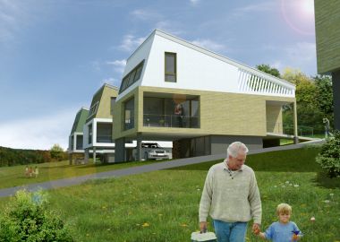 Modern und ökologisch optimiert, präsentieren sie sich als ländlicher Einfamilienhaustypus, der sich in die idyllische Hanglage behutsam einfügt. Der Baukörper berührt nur punktuell den Untergrund und schafft so zusätzliche Flächen für Stellplätze, geschützte Lager- und Aufenthaltsbereiche. Die Erschließung erfolgt über das barrierefrei zugängliche Wohngeschoss. Im Obergeschoss bietet sich dem Eigentümer zusätzlich ein geschütztes „Sonnendeck“ sowie ein atemberaubender Ausblick auf Strinz.