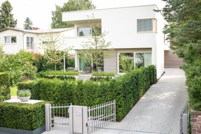 Im Umfeld grüner Vorgärten ist ein Gebäude in klaren kubischen Formen entstanden, das durch seine zurückgesetzte Positionierung auf dem Grundstück einen villenartigen Charakter erhält. Das zweigeschossige Wohnhaus mit Teilunterkellerung ist über eine Zufahrt und einen besonders gefassten Hofbereich erschlossen. Hier empfängt das Obergeschoss mit einer Art offenen „Lichthof“ und schützt zugleich die privaten Schlaf- und Badebereiche vor Einblicken. Das geräumige Erdgeschoss vermittelt großzügig zwischen Wohnen, Essen und Kochen. Die privaten Schlafbereiche sind über einen offenen Salon mit einer Loggia im Obergeschoss verbunden.