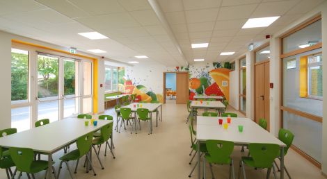 Der Anbau umfasst Räumlichkeiten für Schülerbetreuung und Mensa inkl. einer Schulküche für eine Grund- und Sonderschule. Unter einem vormals überdachten Pausenbereich entstehen neue Räume mit Nord-Süd-Orientierung. Über großzügige Fensterflächen gelingt ein Bezug zum umgebenden Grün. Das Thema der Ruhe, des Rückzuges und des kulinarischen Genusses wird hier durch die freundlichen Innenbereiche mit Sitznischen und Rückzugsbereichen mit Naturkontakt bewusst befördert.